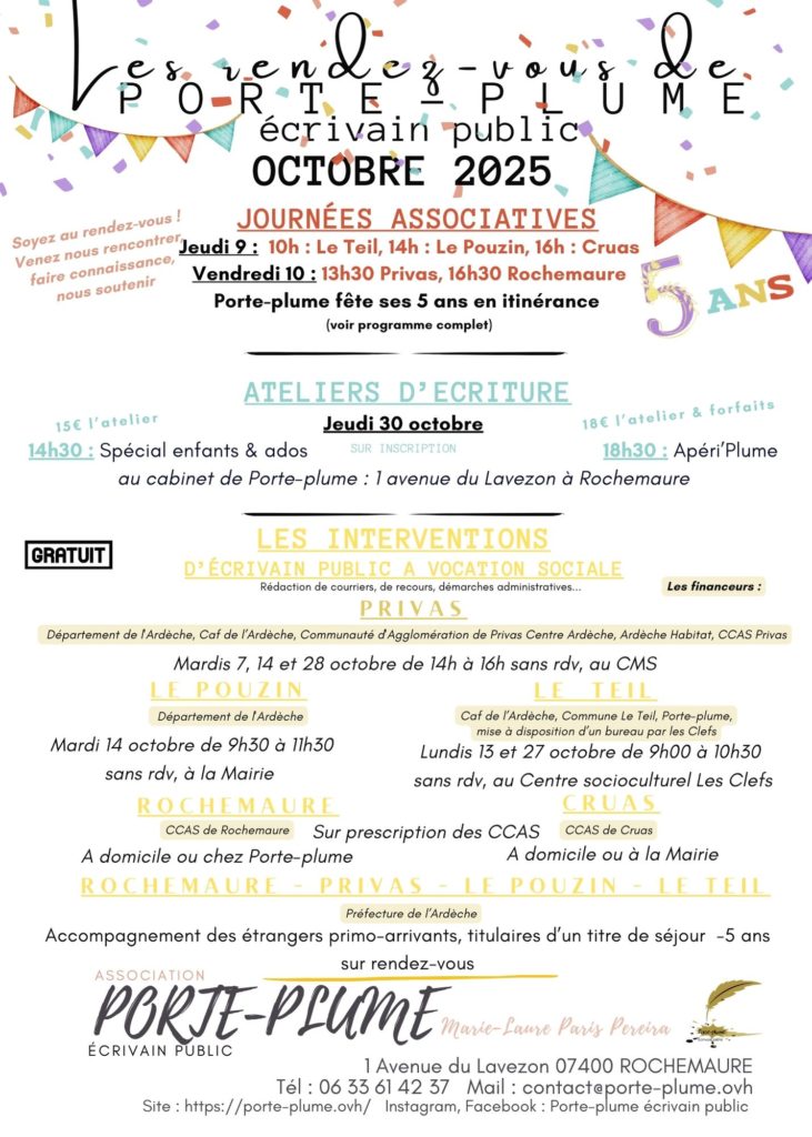 Dans le cadre de la convention avec le Conseil Départemental de l’Ardèche, Porte-plume anime des ateliers collectifs sur des thèmes de gestion administrative (un peu limités par la crise sanitaire) —) en plus clair : « Mes papiers & moi ». Le prochain atelier aura pour thème : « Je commence par où » au CMS du Teil et de Privas.